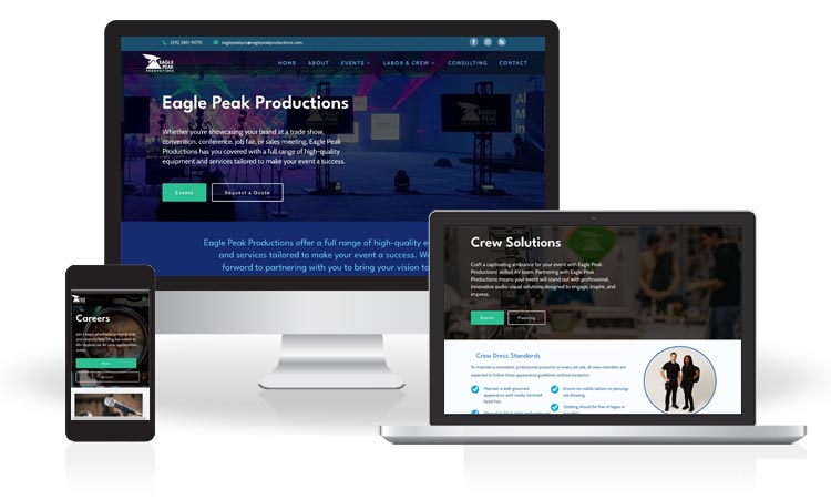 The Eagle Peak Productions layout is clean and confident, with strong visual hierarchy and clear messaging about the AV services they provide.